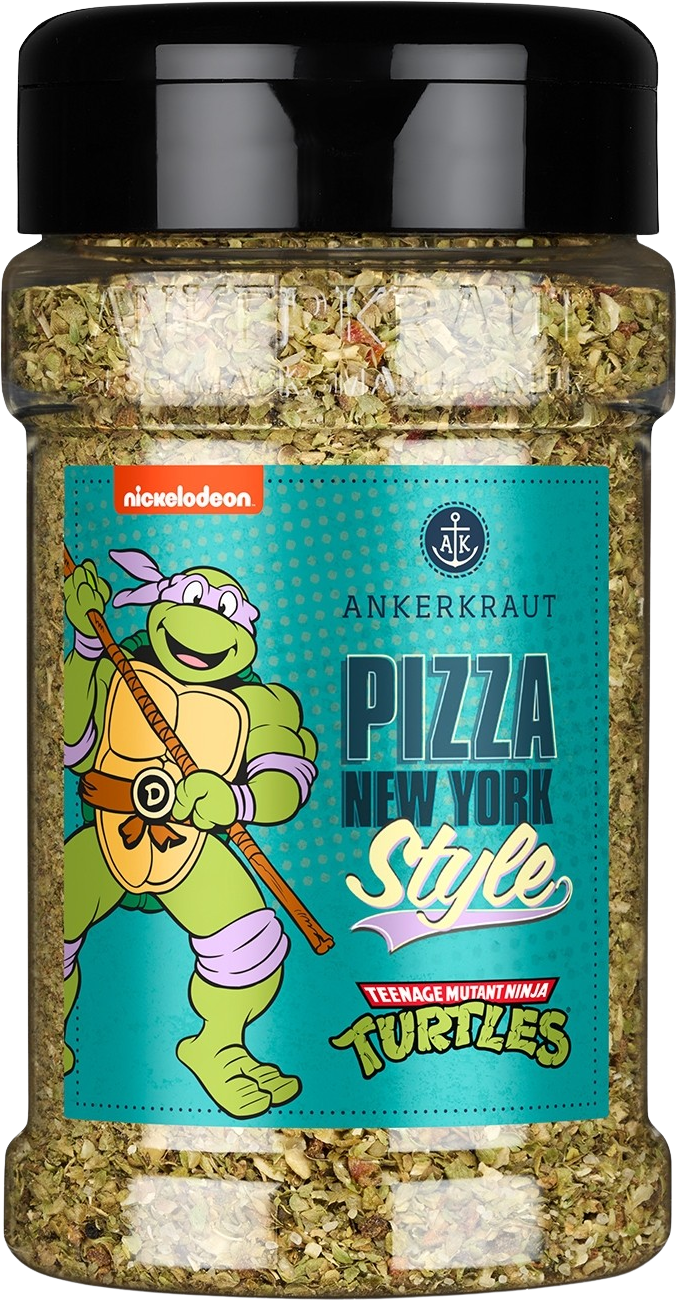 Tutti sanno che il cibo preferito delle Tartarughe Ninja è la pizza! Con il Mix di spezie per Pizza New York Style puoi trasformare la tua pizza appena sfornata in un vero classico newyorkese. La composizione di origano, sale marino, aglio e paprika ha un sapore unico. Il prodotto è completamente senza esaltatori di sapidità, zuccheri aggiunti o additivi. Scegli il tuo personaggio preferito tra Donatello, Raffaello, Michelangelo e Leonardo e dona alla tua pizza un sapore fantastico!