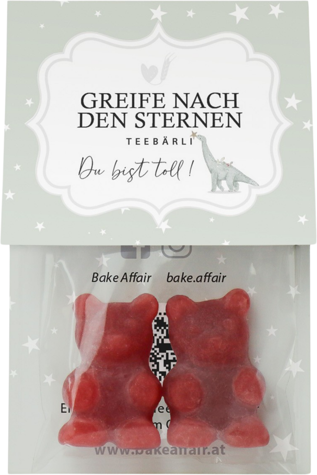 Cerchi un regalo dolce per una persona speciale? Con i Teabears di Bake Affair vai sempre sul sicuro. I Teabears “Reach for the Stars” si trasformano in pochi istanti in una tisana alla frutta dal delizioso gusto di fragola, amata da grandi e piccini. La confezione riporta la scritta "Sei fantastico" in tedesco e contiene teneri orsetti gommosi, perfetti anche da gustare come piccolo snack dolce.