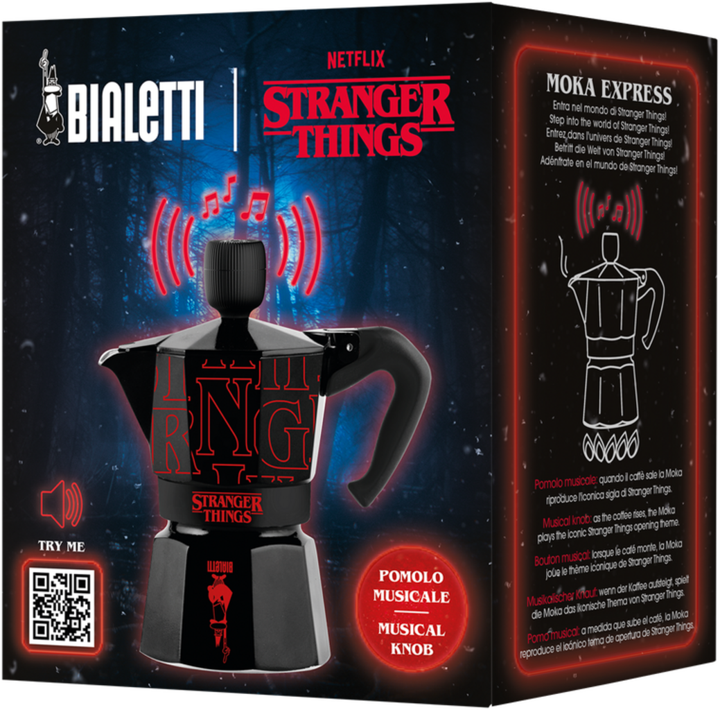 Questa versione con un fantastico look ispirato alla serie "Stranger Things" trasforma ogni pausa caffè in qualcosa di straordinario. Oltre ad avere un design incredibile, lo speciale pomolo musicale diffonde le note della sigla di Stranger Things durante la preparazione del caffè. Un must assoluto per tutti i fan della serie cult e, naturalmente, un regalo meraviglioso.