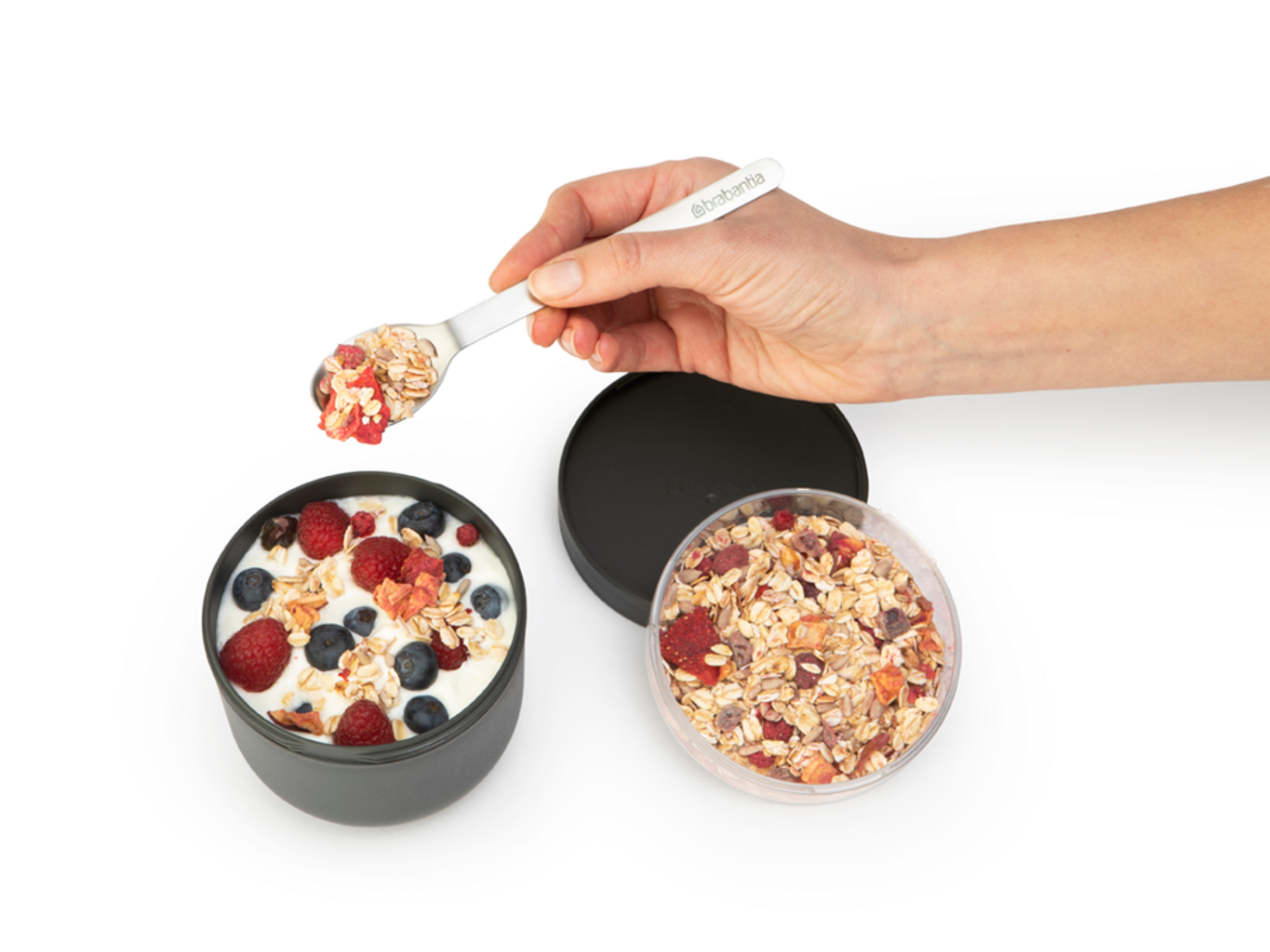 Goditi una colazione fresca e gustosa ovunque tu sia, in treno, in ufficio o a scuola, con il contenitore porta colazione della linea Make & Take di Brabantia. Grazie al pratico contenitore separato con tappo a vite e alla chiusura ermetica, puoi trasportare fino a 0,5 litri di muesli, porridge o yogurt senza rischi di fuoriuscite. Ideale per microonde e congelatore, è la soluzione intelligente e comoda per iniziare la giornata al meglio, ovunque tu vada.