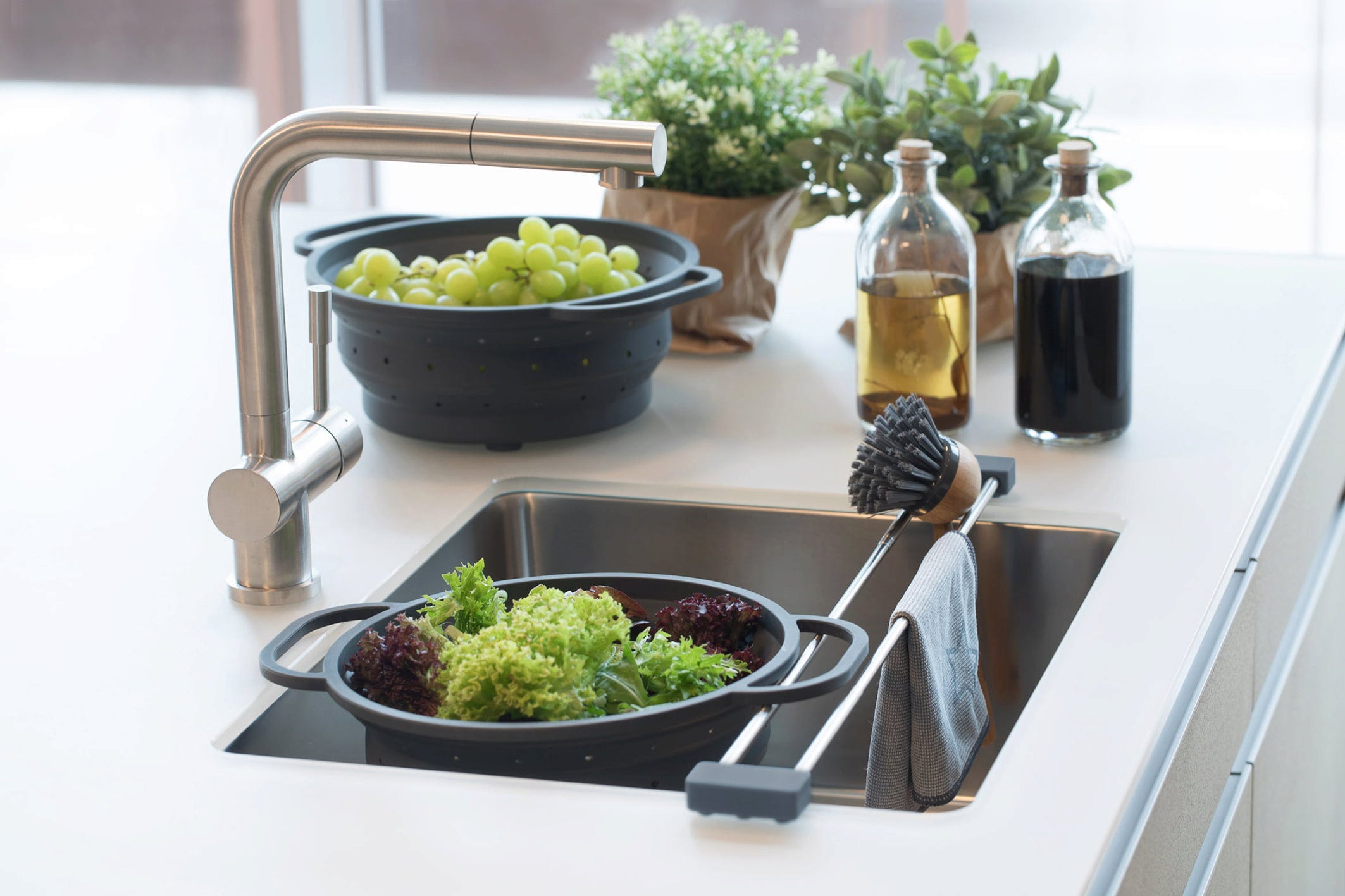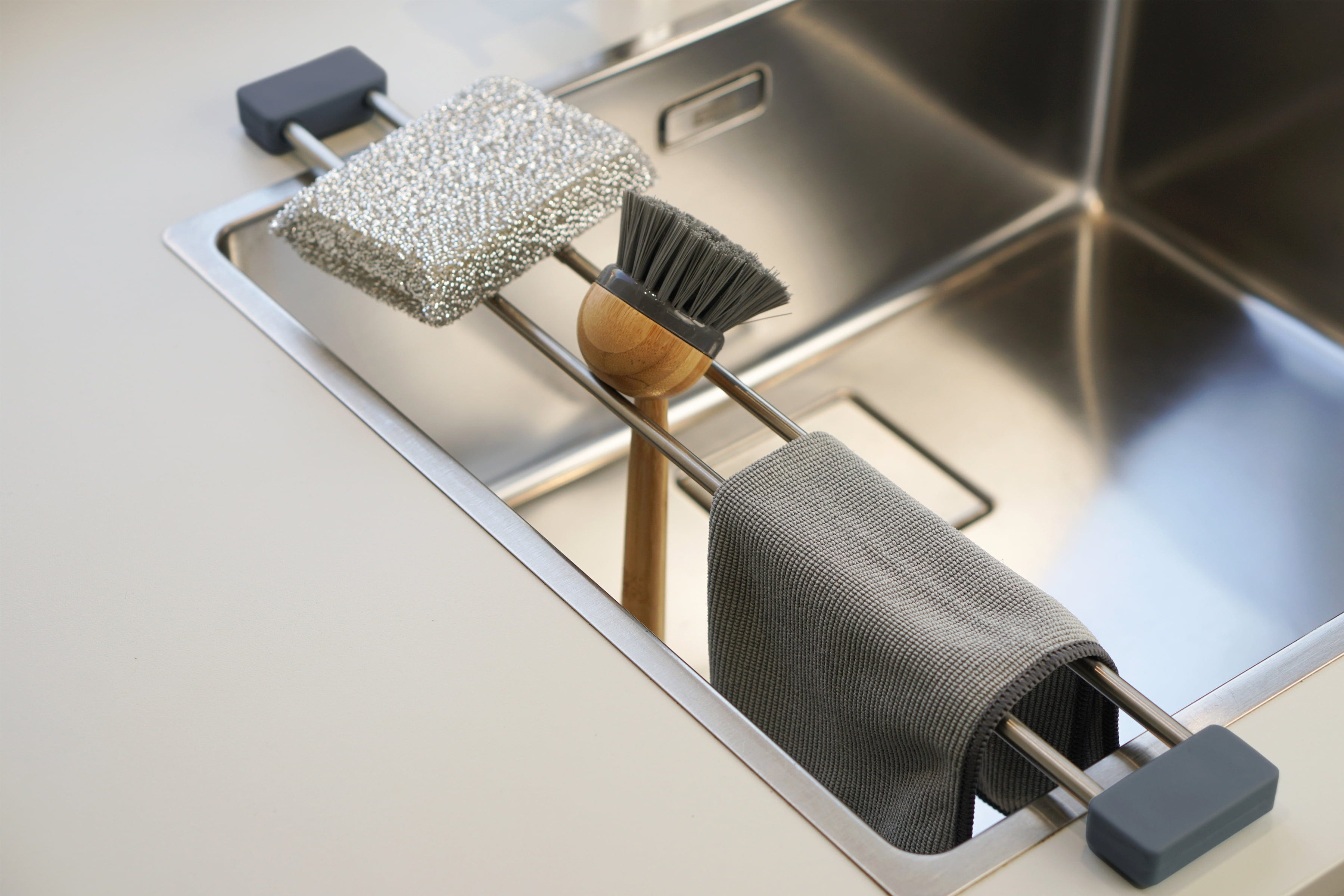 Dimentica panni umidi e superfici poco igieniche. Con drip.line crei facilmente uno spazio pulito per spugne, spazzole e panni, permettendo loro di asciugarsi all'aria. La struttura è estensibile e si adatta a quasi tutti i lavelli.