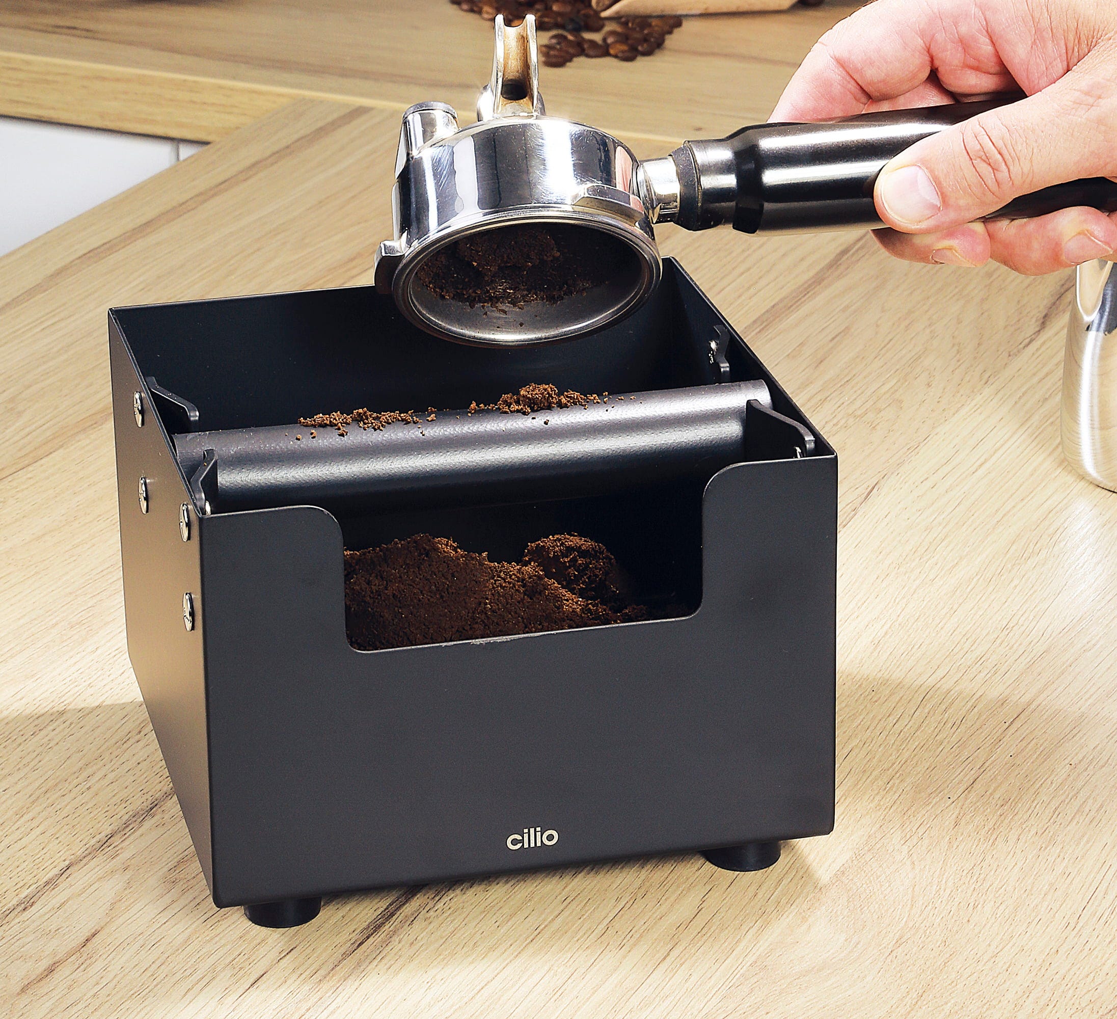 Il battifondi BARISTA di cilio è la soluzione pulita e professionale per ogni angolo caffè. Invece di svuotare il portafiltro nel cestino o nel lavello, questa knock box offre un punto sicuro per i fondi di caffè ancora caldi. La barra di battuta è rivestita in gomma per attutire efficacemente i colpi, rendendo l'operazione più silenziosa e proteggendo i bordi delicati del portafiltro da graffi e ammaccature.