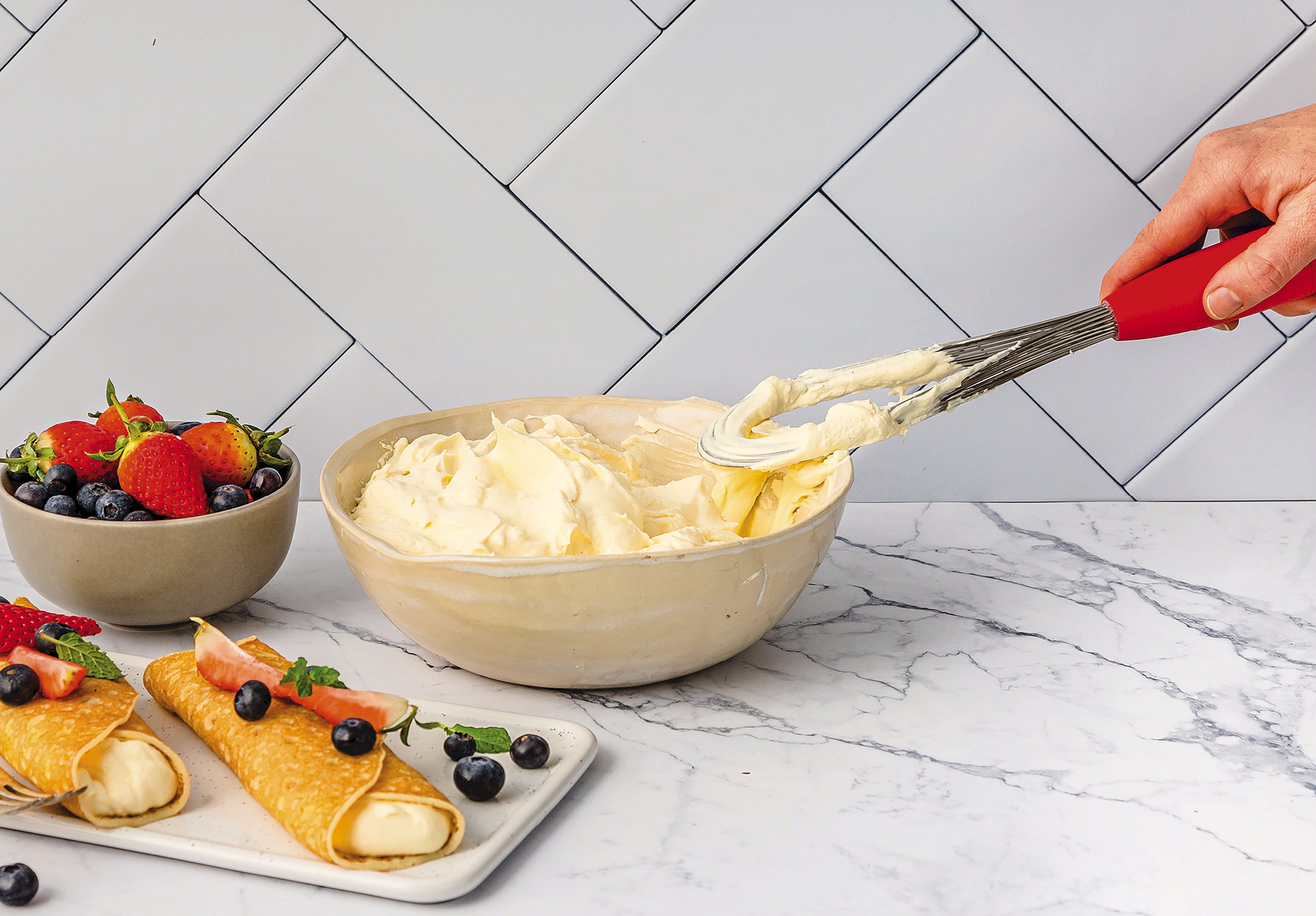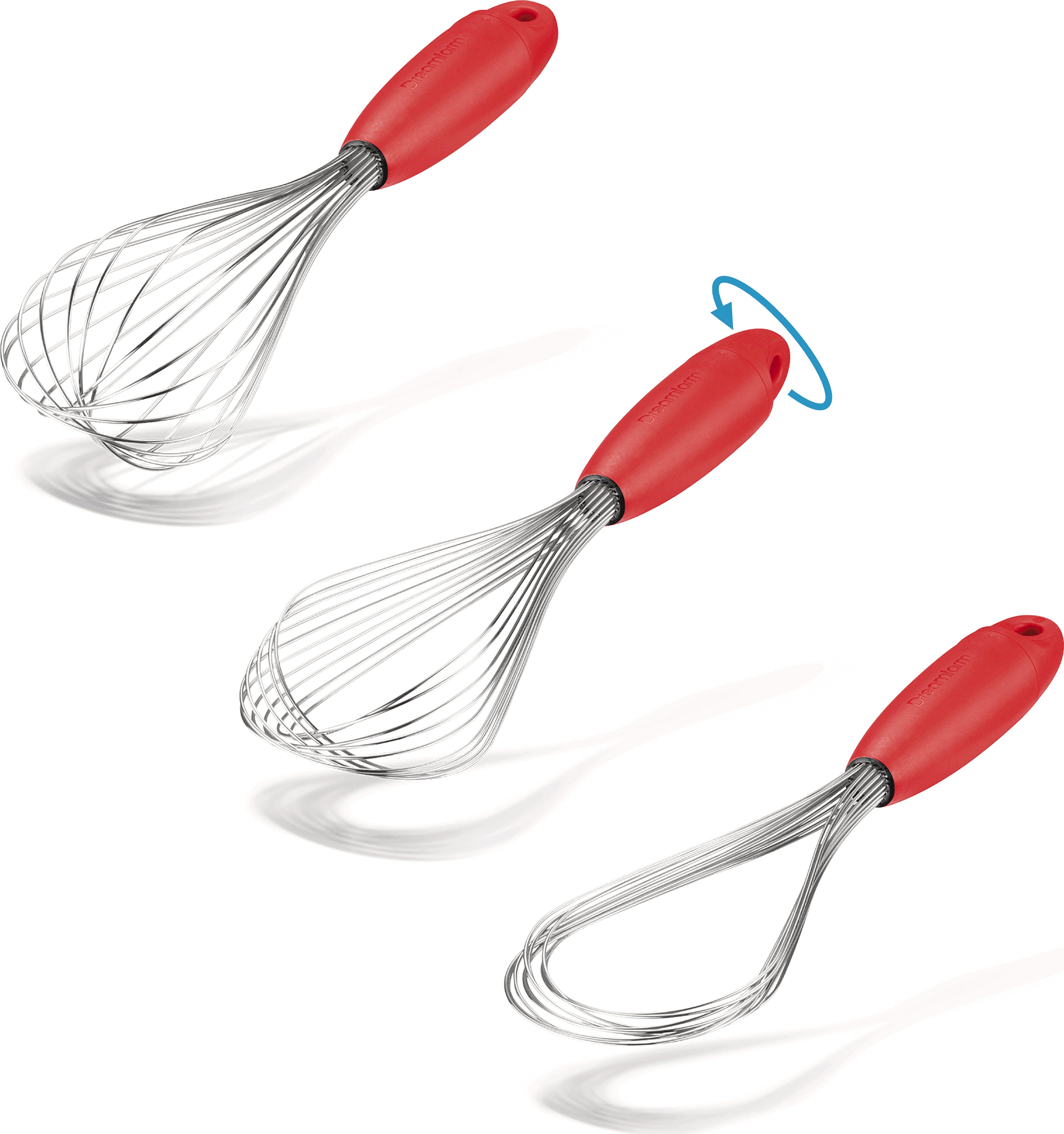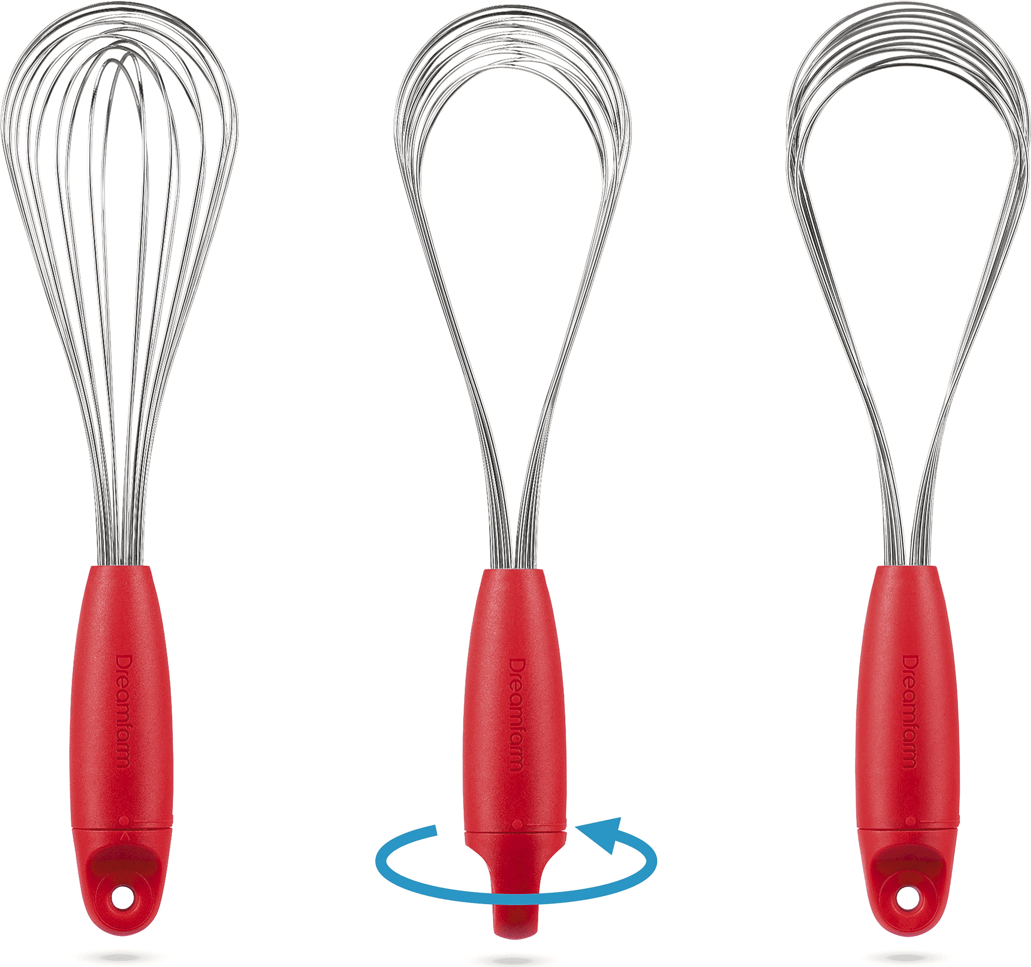 La frusta Flisk di Dreamfarm è un'innovativa frusta che si trasforma in tre diverse forme con una semplice rotazione del manico. Nella configurazione a palloncino è perfetta per montare la panna in modo soffice, mentre la posizione più piatta è ideale per salse, riduzioni e preparazioni in padelle basse. Dopo l'uso può essere ripiegata completamente in piano, occupando pochissimo spazio nel cassetto delle posate ed evitando di impigliarsi negli altri utensili.