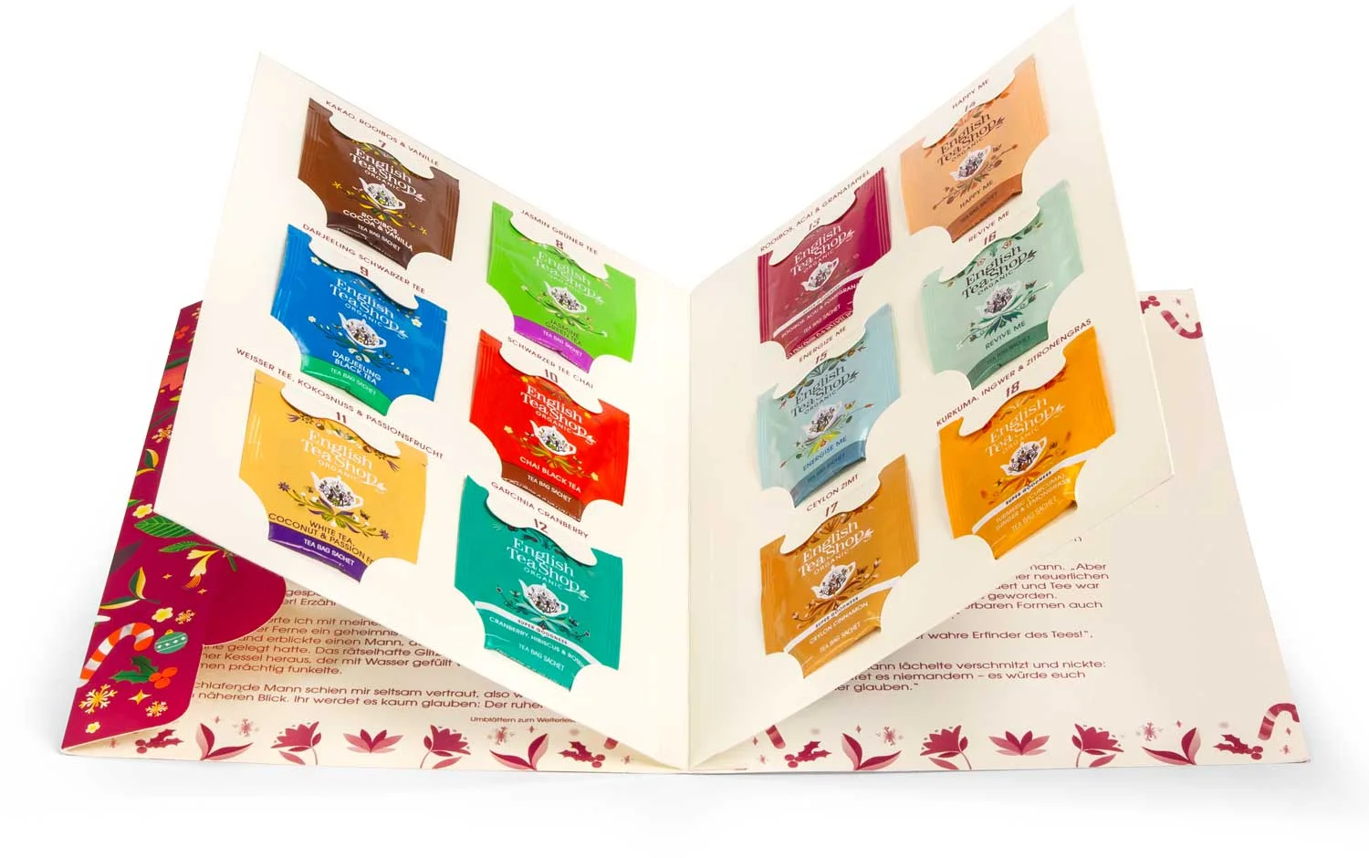 Questo speciale calendario dell'Avvento è sfogliabile come un libro e contiene 24 tè e tisane biologici distribuiti su più pagine. Tra le varietà ci sono ovviamente le miscele invernali e natalizie, che sono accompagnate da una divertente favola di Natale (in lingua tedesca) da leggere ad alta voce in famiglia. Ideale per gli amanti del tè e delle tisane che vogliono concedersi una piacevole pausa durante l'Avvento.