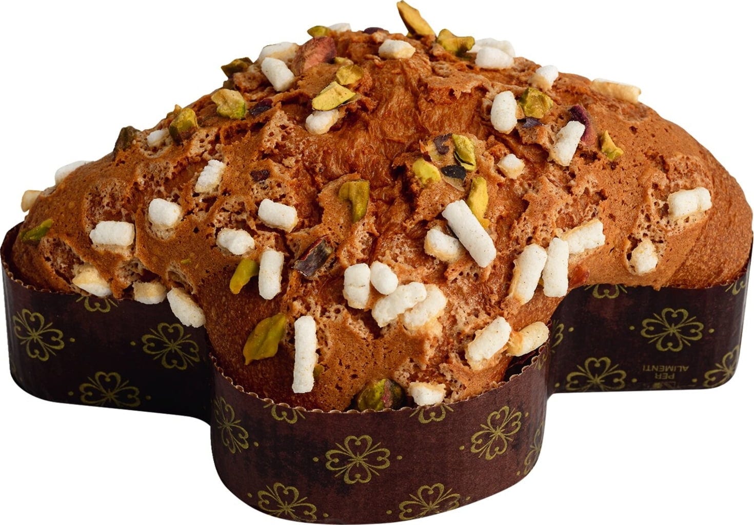 Il soffice impasto è arricchito con essenza di mandarino ma è senza canditi. Una deliziosa glassa di mandorle e pistacchi aggiunge un tocco croccante e dolce ed è completata con granella di zucchero e pistacchi.