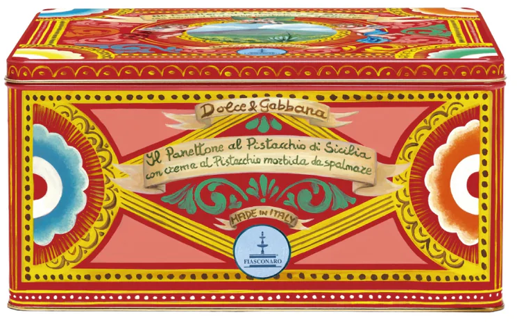 La splendida scatola in metallo, dal design esclusivo Dolce & Gabbana, contiene una vera specialità Fiasconaro: un panettone soffice e morbido, ricoperto da un generoso strato di glassa al cioccolato bianco e croccanti pistacchi interi. Per completare il piacere, è incluso anche un vasetto di deliziosa crema al pistacchio Fiasconaro, perfetta da spalmare su una fetta di Panettone, con stile, utilizzando l'apposito coltello di pregiata fattura incluso nel set.