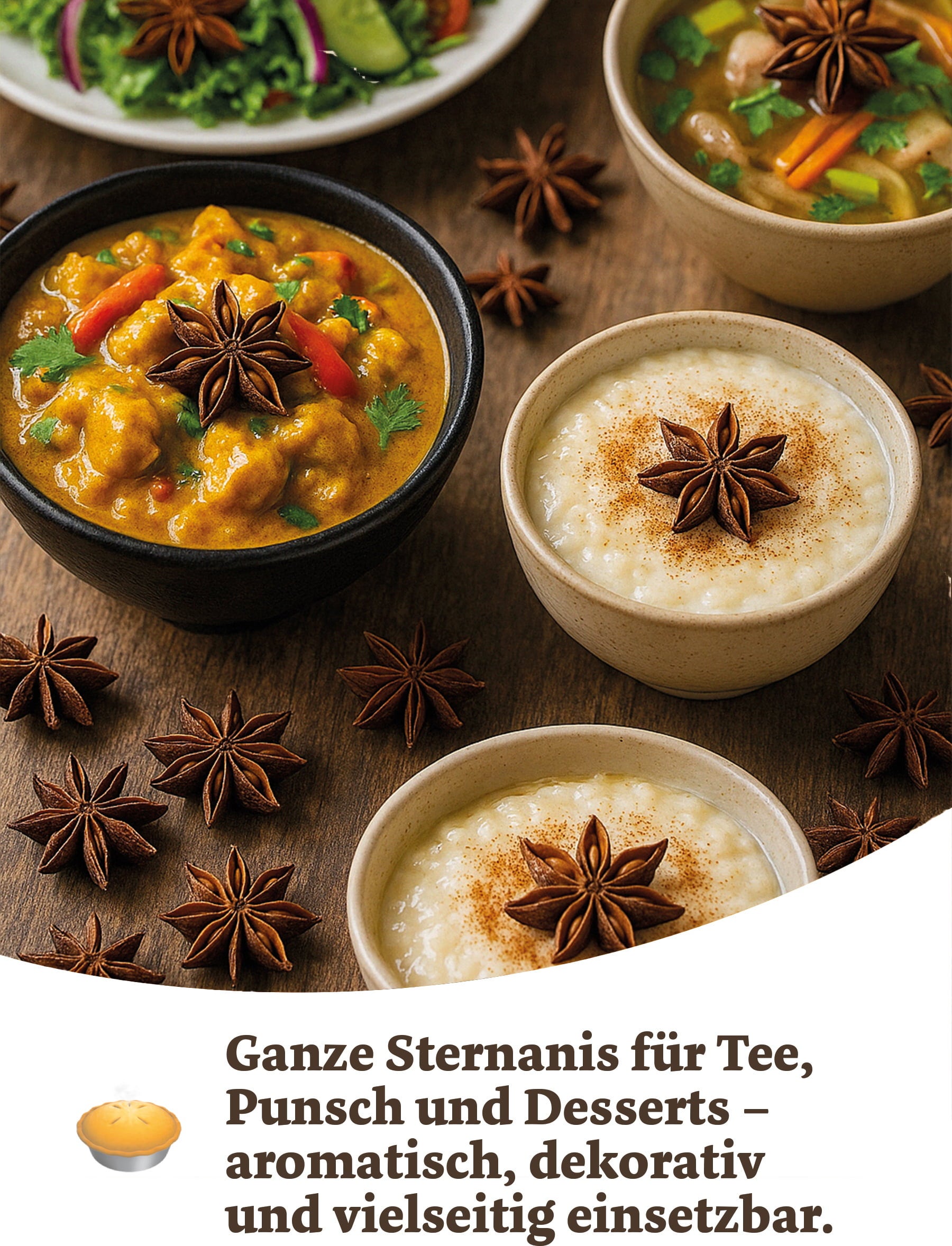 L'anice stellato è una spezia che si adatta per la preparazione sia di piatti salati che dolci. È particolarmente popolare nel periodo natalizio, oltre che per il suo caratteristico aroma, anche per la sua scenografica forma a stella. L'anice stellato, dolce e aromatico, conferisce a cibi e bevande una nota unica. Si utilizza in particolare per piatti a base di carne o di pesce, zuppe, salse, confetture, tè, dessert e composte.