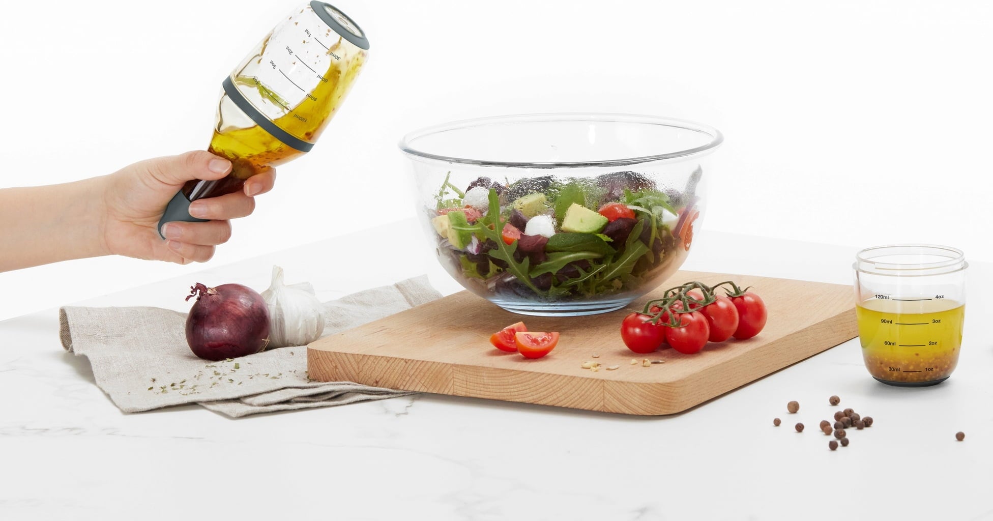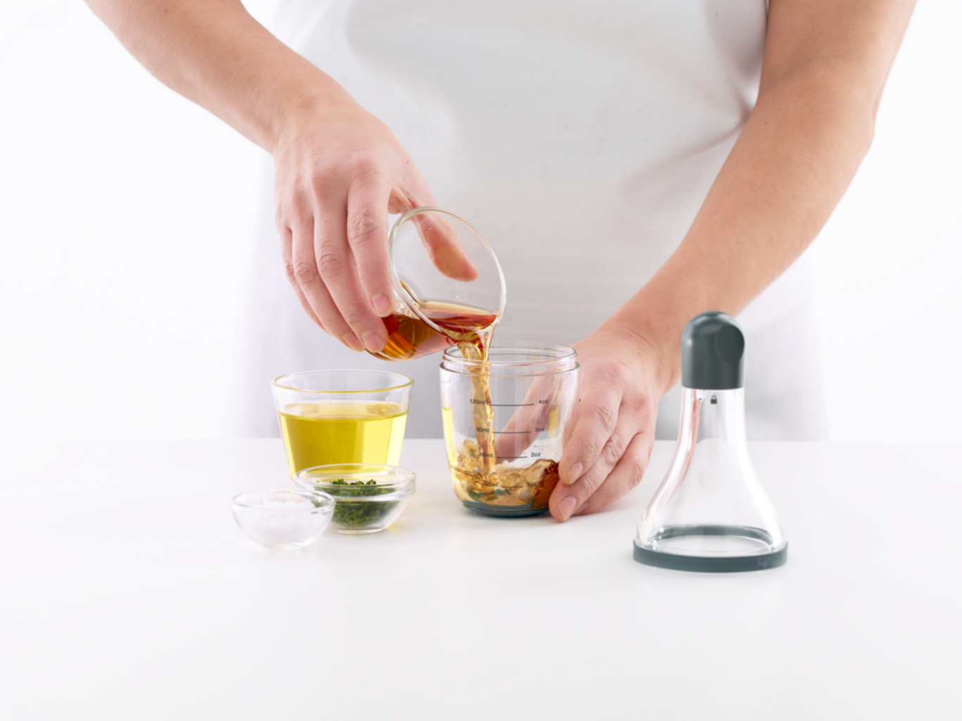 Grazie all’ampia apertura, puoi riempirlo facilmente con ingredienti freschi, mentre le tacche graduate integrate ti aiutano a dosare tutto con precisione, secondo il tuo gusto. Basta chiuderlo con il coperchio in silicone platinico, sicuro e a tenuta stagna, per agitare energicamente senza rischi di fuoriuscite. Una sfera interna intelligente garantisce che tutti gli ingredienti, dall’olio all’aceto, fino alle erbe e alle spezie, si amalgamino perfettamente in un condimento cremoso e omogeneo.