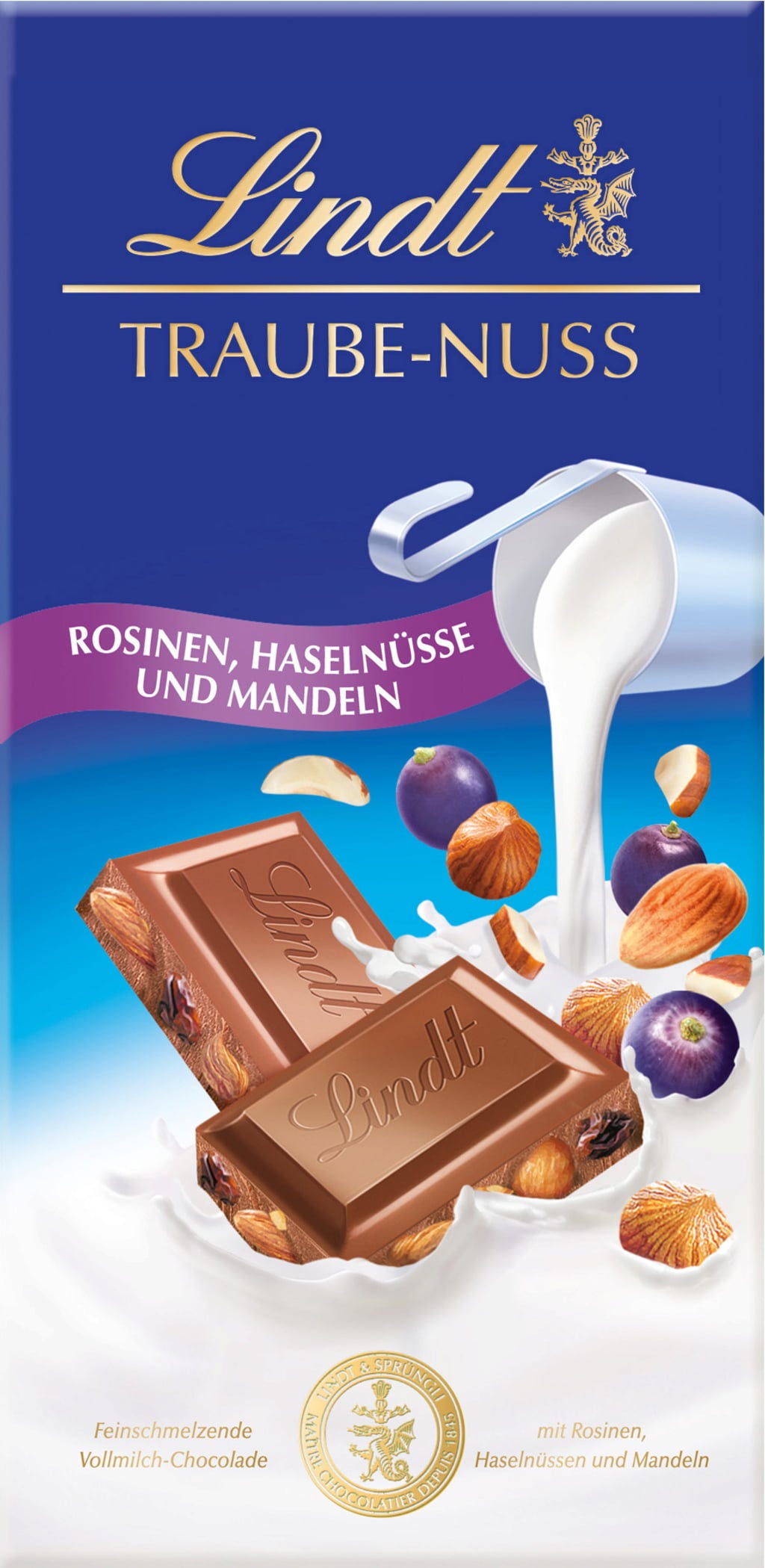 Questa creazione Lindt combina finissimo cioccolato al latte con uvetta fruttata e croccanti pezzi di nocciole e mandorle. Il carattere equilibrato della tavoletta offre un'esperienza di gusto speciale.