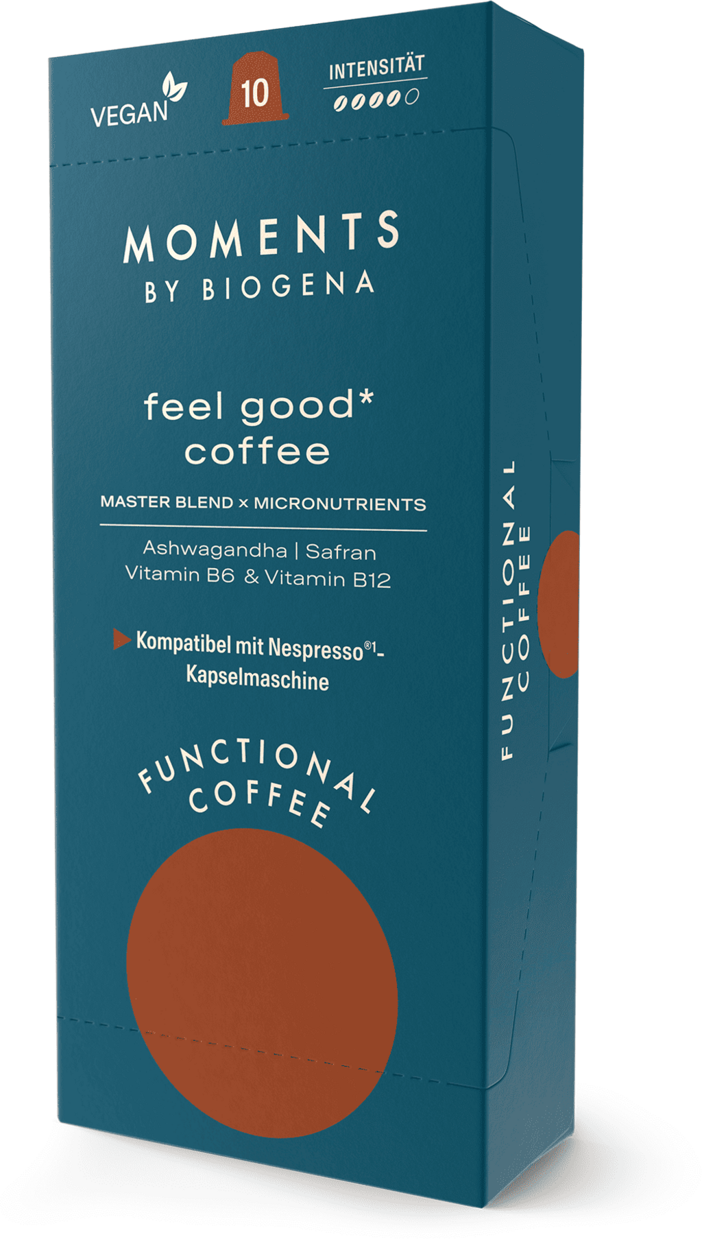 feel good* coffee con Ashwagandha, zafferano, vitamina B6 e B12 rappresenta un ulteriore passo avanti di alta qualità per il tuo rituale quotidiano del caffè. Il gusto è unico e senza compromessi, la composizione è di alta qualità e la praticità rimane particolarmente elevata.