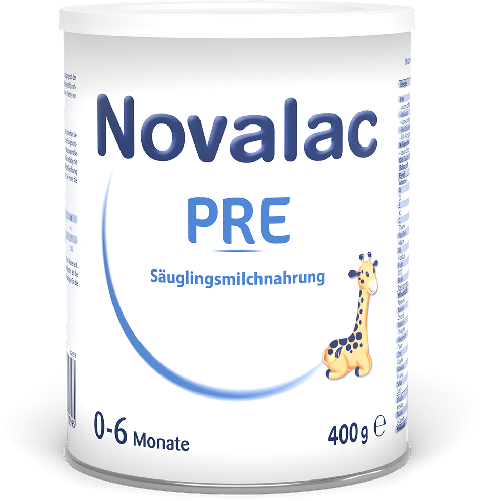 Novalac PRE è una formula per lattanti per bambini che non sono allattati al seno o lo sono solo parzialmente. Poiché Novalac PRE ha un'elevata percentuale di lattosio (zucchero del latte) tra i carboidrati, la formula è simile al latte materno. Inoltre Novalac PRE è arricchito con gli acidi grassi Omega-3 e Omega-6 nonché con galattoligosaccaridi (GOS). Naturalmente, la formula contiene anche un gran numero di vitamine e minerali, che garantiscono al bambino un apporto ottimale dei nutrienti più importanti.