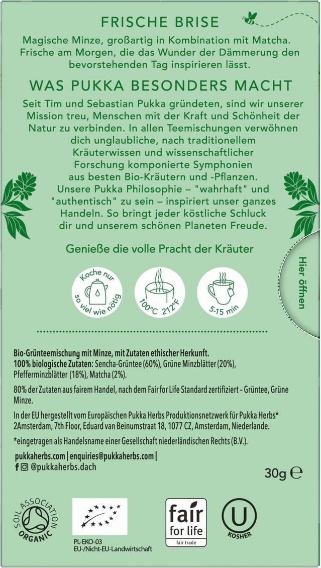 Questo tè verde unico è stato creato dagli esperti erboristi e nutrizionisti di PUKKA, combinando le più recenti scoperte scientifiche con la tradizionale conoscenza delle erbe. Il risultato è una combinazione sinergica di menta biologica, menta piperita, tè verde sencha e matcha, che crea una tazza equilibrata con aromi rinfrescanti e note delicate e ricche. Per una tazza deliziosa e ricca di sapore rinvigorente.