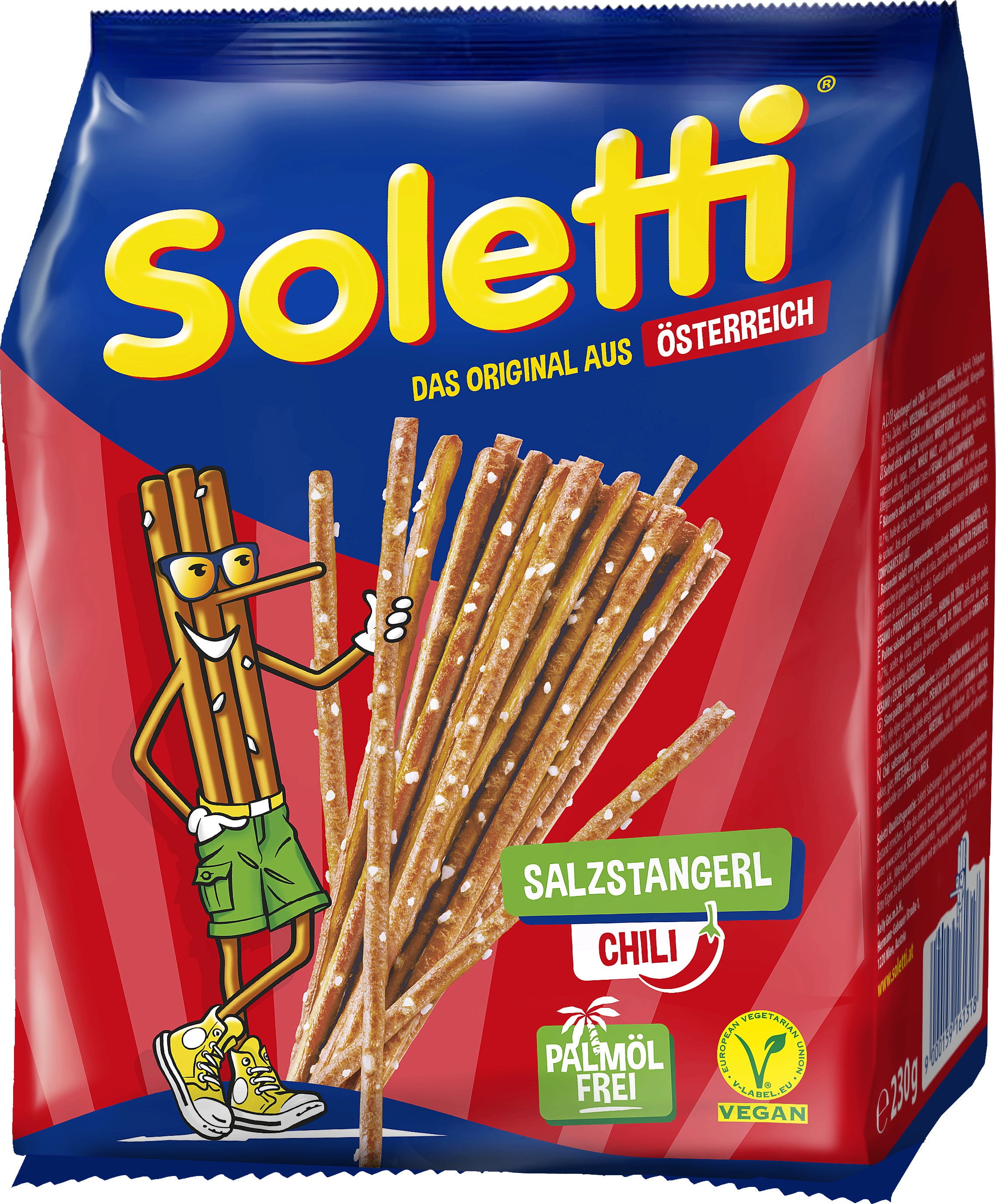 Con questa variante, Soletti offre un'alternativa piccante ai bastoncini salati classici. Sono realizzati con cereali austriaci e raffinato con sale delle Alpi austriache. Il peperoncino in polvere finemente macinato dona un tocco piccante.