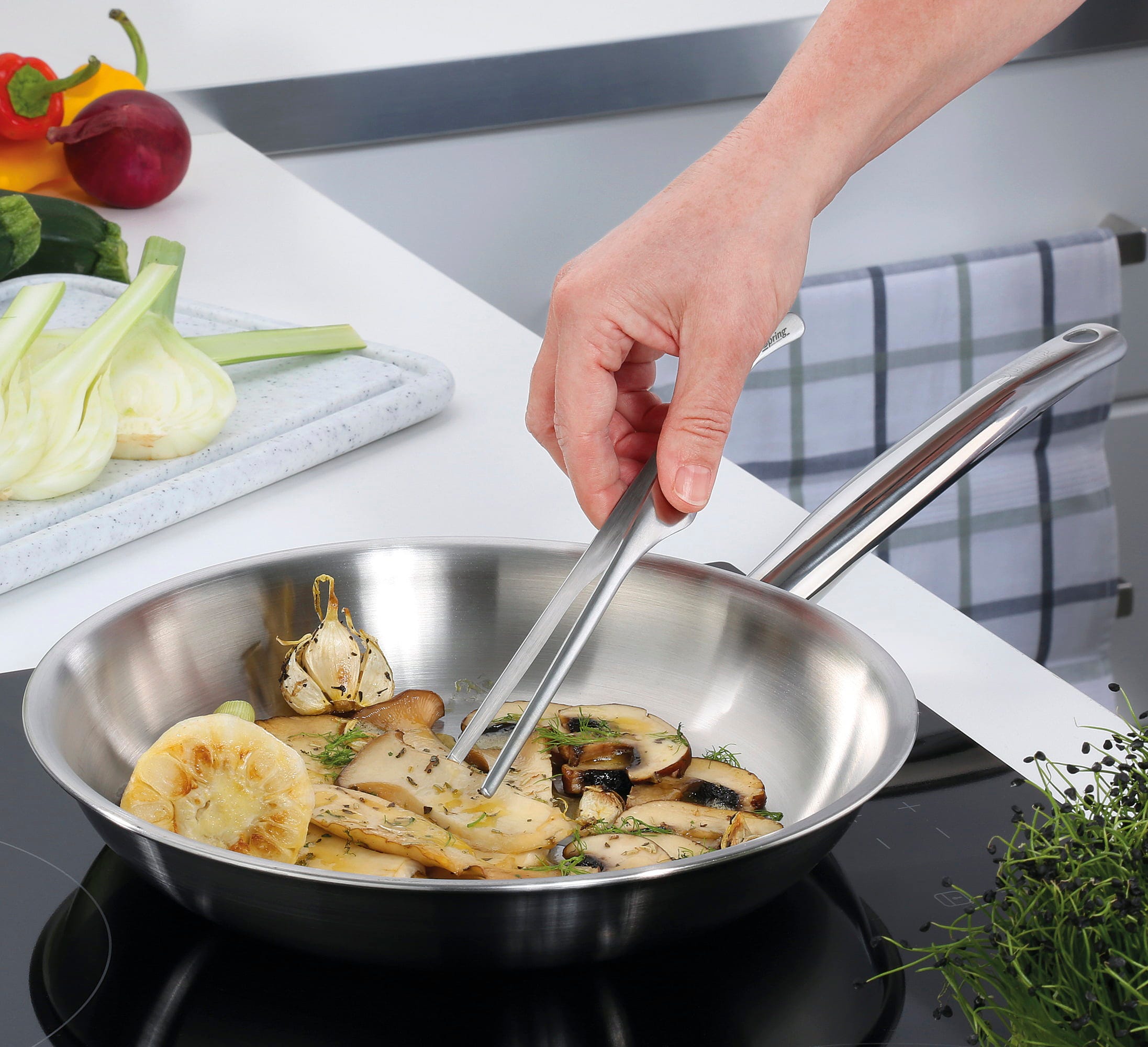Con la linea Brigade Premium di Spring porti nella tua cucina la vera qualità della ristorazione professionale! Il materiale multistrato a 5 strati ad alta conducibilità trasmette il calore immediatamente dal fondo alle pareti, avvolgendo gli alimenti in modo uniforme ed efficiente da tutti i lati. Grazie ai manici ergonomici in acciaio inox, hai sempre il pieno controllo durante la preparazione.