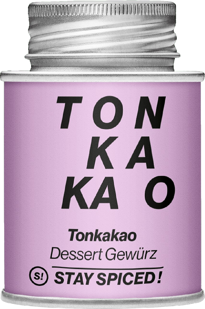 La miscela Tonkakao di Stay Spiced! non è composta solamente da fava tonka e cacao, come ci si aspetterebbe dal nome. O meglio, questi due ingredienti sono ovviamente presenti, ma nel mix ci sono anche lo zucchero d'acero, la cannella e la vaniglia. L'ingrediente principale è la grue di cacao, cioè una granella di fave di cacao tostate.