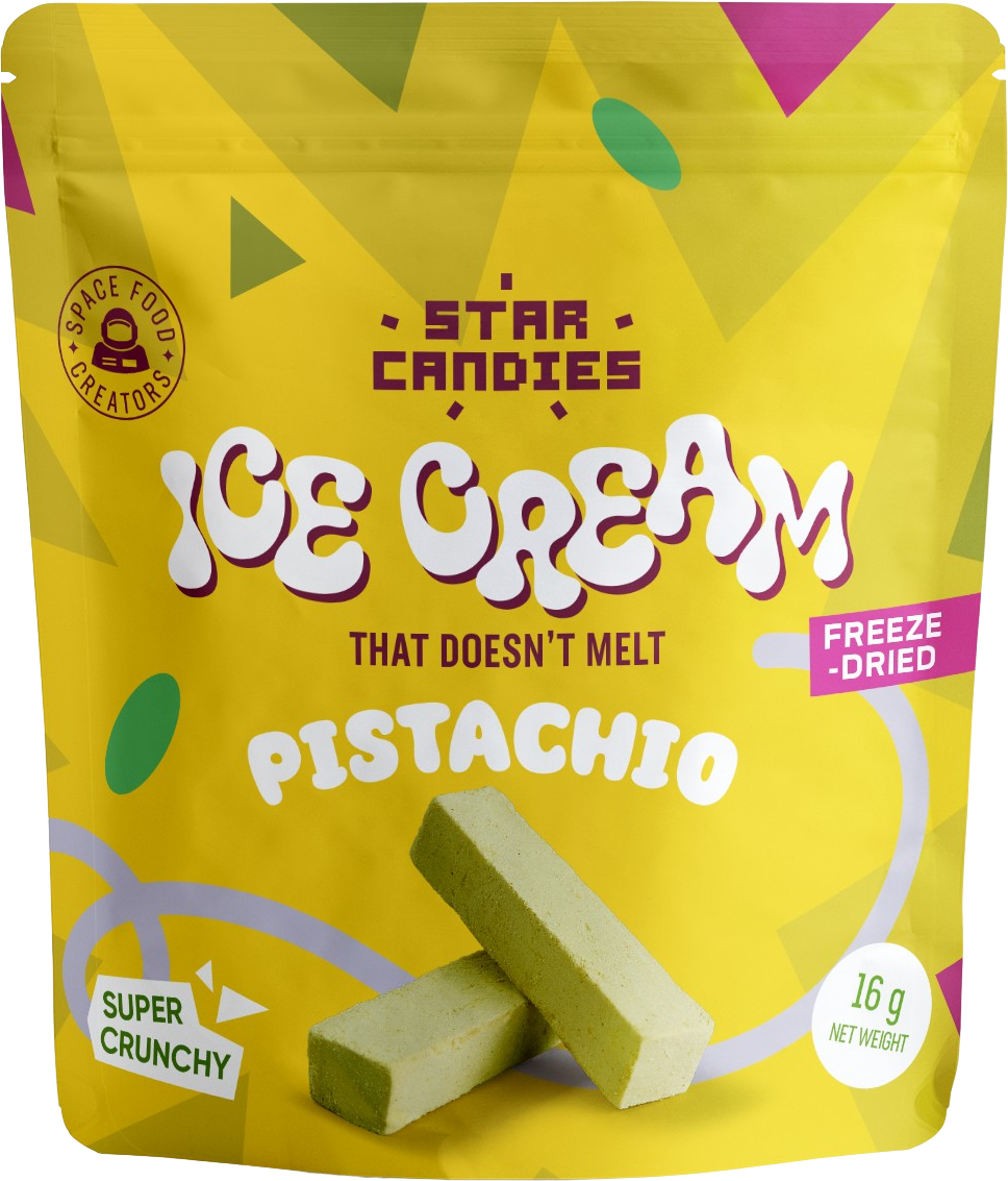 Scopri il gelato liofilizzato STAR CANDIES al pistacchio di Super Garden. Un dessert straordinario, dal gusto pieno e dalla consistenza croccante e leggera, che non si scioglie: tutto il piacere del gelato, senza bisogno di freezer.