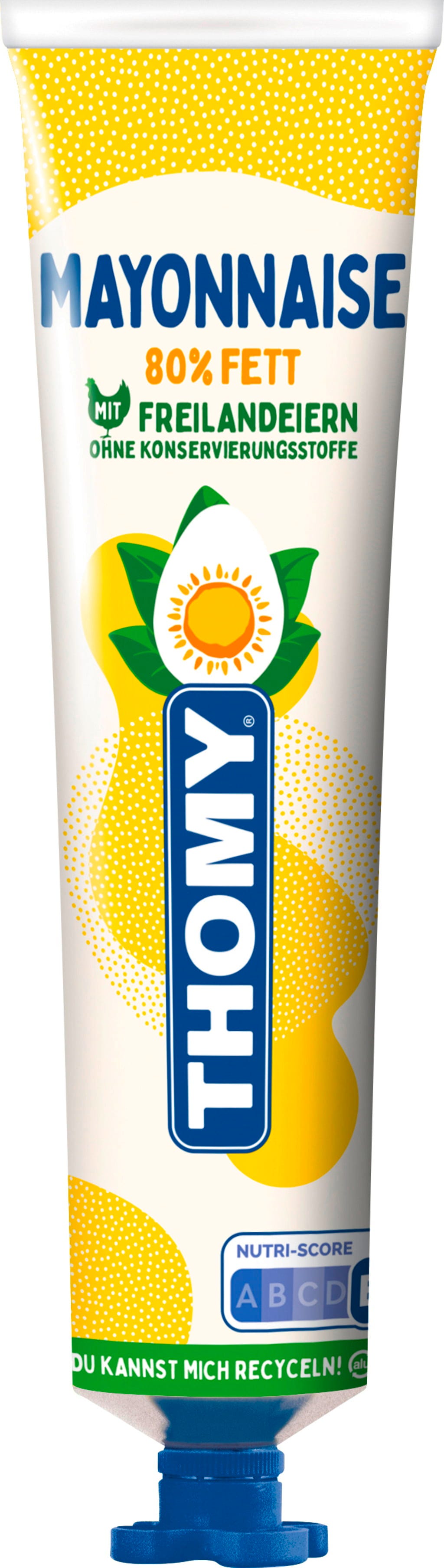 La maionese THOMY con 80% di grassi è cremosa, ricca di gusto e un vero must in ogni cucina. Preparata con uova da allevamento all'aperto e puro olio di girasole, conquista per la qualità e il tipico sapore della maionese. Il pratico tubetto permette un dosaggio semplice e pulito.