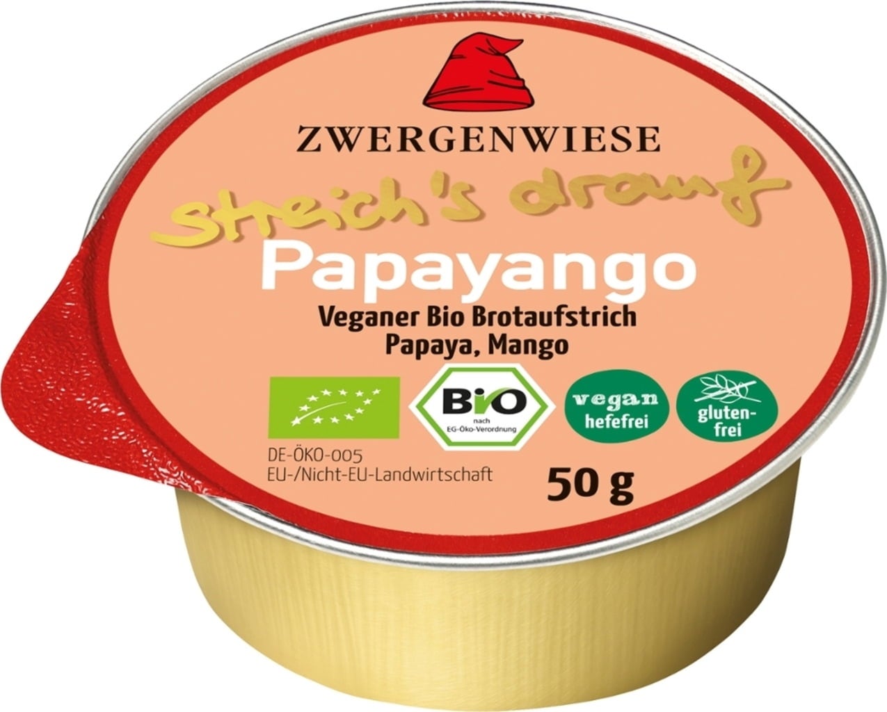 Kleiner streich's Papayango di Zwergenwiese è una crema spalmabile vegana e incredibilmente cremosa in versione monoporzione. La papaia e il mango maturati al sole le conferiscono una nota dolce ed esotica, mentre il curry fornisce un tocco orientale e piccante che ne smorza la dolcezza creando un'armonia di sapori unica. La crema è 100% gluten free e gli ingredienti provengono da produzione biologica controllata.